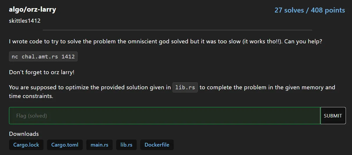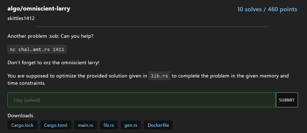 Yay! Good job, here's your flag and remember to orz larry: amateursCTF{orz-larry-how-is-larry-so-orz-4efe27a2edde418184d668992819a62fa4b3a7e6ba5ac3a204be9a66ed7b7105}omniscient-larry