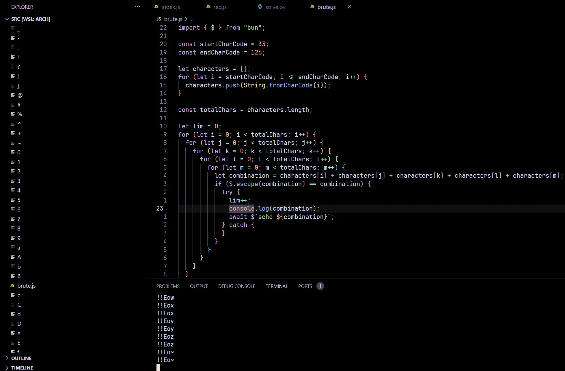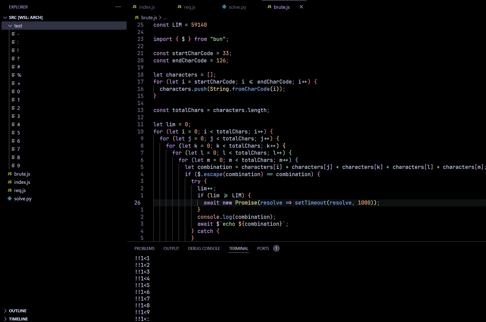 In order to prevent my work folder getting littered with random files again, I created a test folder, cd into it and run bun ../brute.js instead and started binary searching for LIM