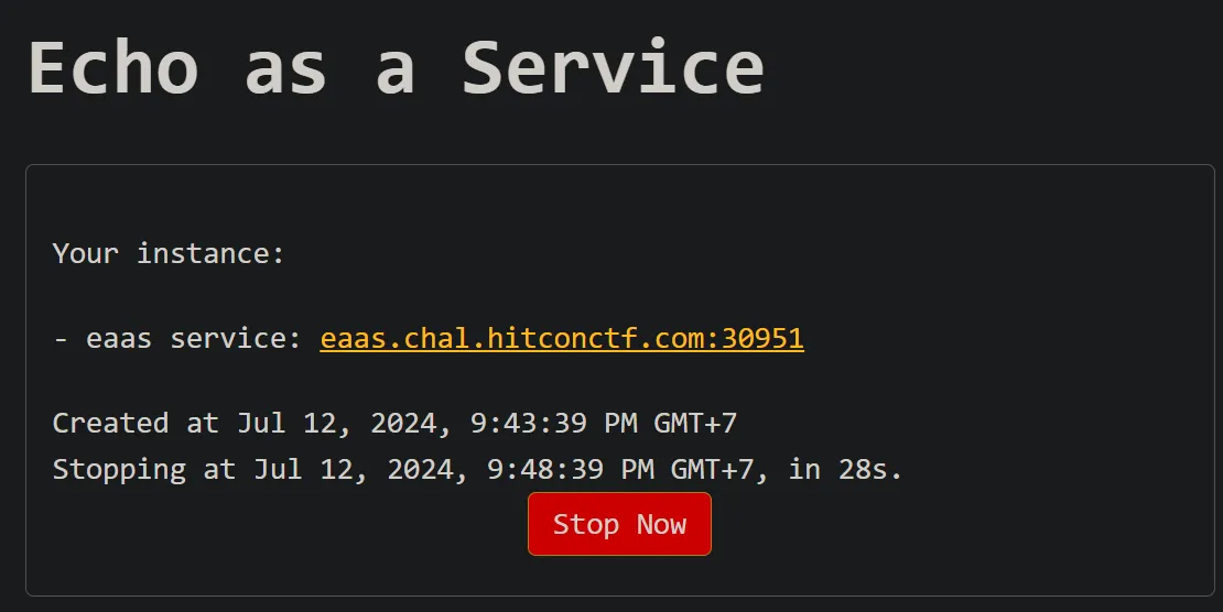 NOTEThe source code of the challenge can be found here: https://github.com/hitconctf/ctf2024.hitcon.org/releases/download/v1.0.0/eaas-a9e76a905cbde9556353890f49ca9bc6bcd3aade.tar.gz